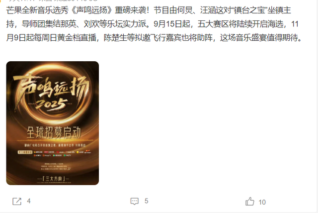 从2021年到现在,已经过去四年,芒果终于开始再次组织大型选秀节目,从传出的消息上看,这档选秀综艺名叫《声鸣远扬2025》,这档综艺节目是六家省级卫视,芒果和鹅共同制作的优秀歌唱人才选拔节目,俗称“选秀综艺”。