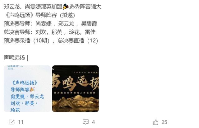 从传出的消息上看,预选赛的导师有尚雯婕、郑云龙、吴碧霞,而送决赛的导师有刘欢、那英、玲花、雷佳,不得不说,导师阵容是非常豪华的,各位读者,你们期待《声鸣远扬2025》吗?让我们共同期待杨子女儿“杨海润”的表现吧!