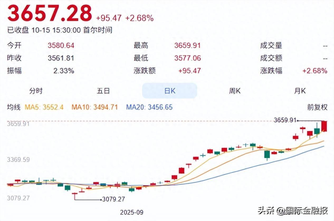 当地时间10月15日,KOSPI指数报收3657.28点,较前一交易日上升95.47点,涨幅2.68%,续创历史新高。