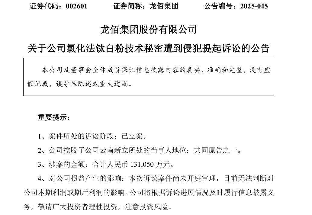 2025年5月15日,云南省楚雄彝族自治州中级人民法院已对先到案的刑事被告人刘建良、江书安、赵泽权侵犯商业秘密罪的案件进行了开庭审理,目前尚未判决。龙佰集团的诉讼请求还提到要在《中国知识产权报》《中国化工报》《人民法院报》或人民法院指定的其他全国性媒体的显著位置刊登声明,就其侵权行为向原告赔礼道歉。