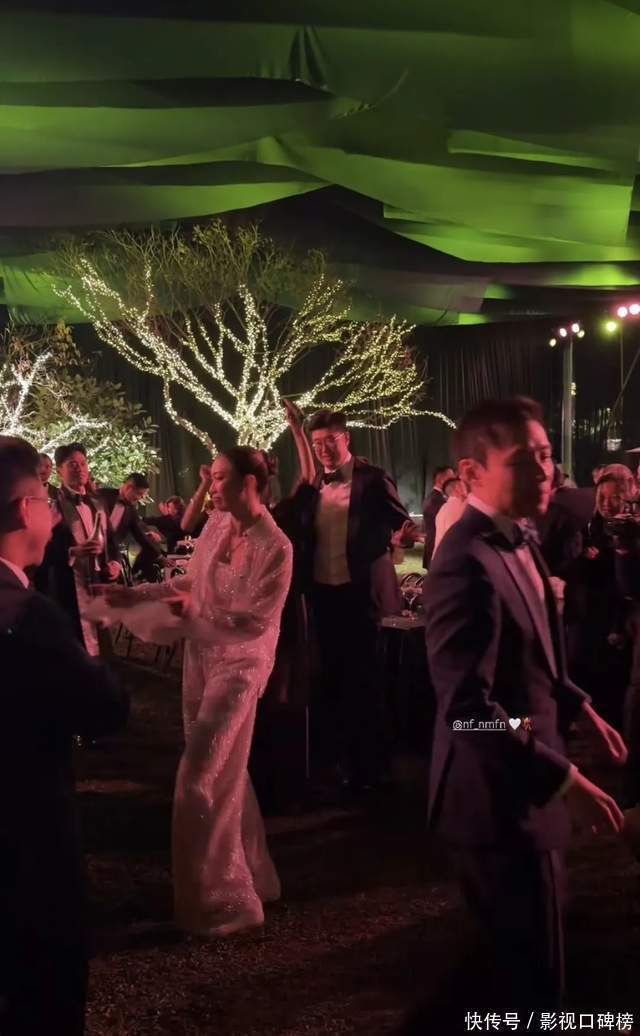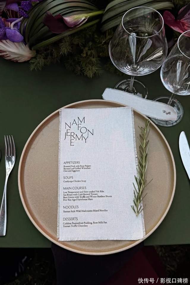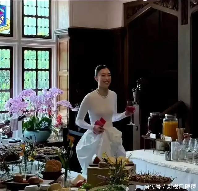 据了解,霍启仁与Namfon婚宴在室内举办,以长桌宴为主,以当地的名吃为主食。Namfon换了一套吊带晚礼裙,在现场招呼宾客。