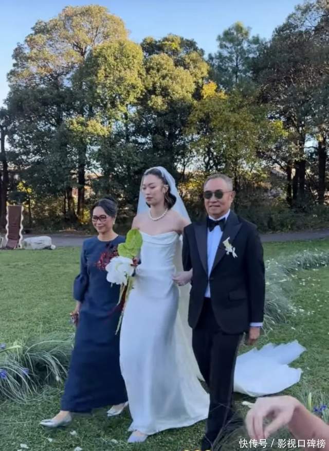 Namfon由父母送她出嫁,妈妈穿着藏蓝色的紧身长裙,戴着眼镜,将头发盘起。爸爸穿着西装,戴着墨镜,Namfon的父母气质温文尔雅。夫妻俩亲手将女儿托付给霍启仁,画面很温馨有爱。